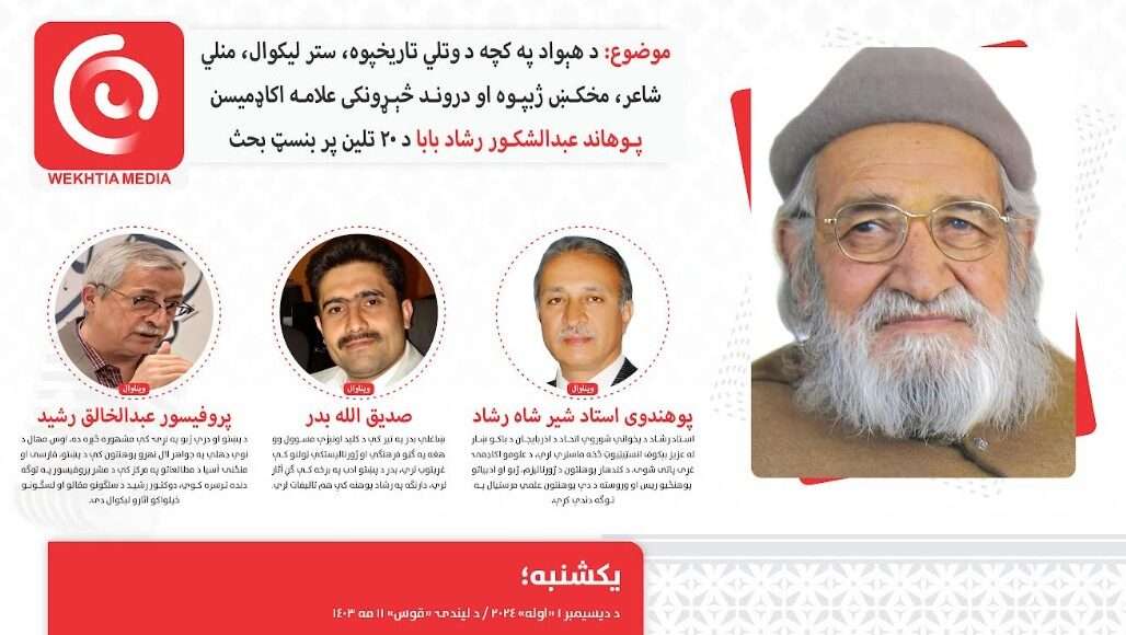 په کابل کې د علامه عبدالشکور رشاد بابا شلم تلین په انلاین بڼه ولمانځل شو. تېره یکشنبه د لیندۍ یا قوس پر ۱۱مه په کابل کې د ویښتیا میډیا له لورې د هېواد په کچه د وتلي تاریخپوه، ستر لیکوال، منلي شاعر، مخکښ ژبپوه او دروند څېړونکې علامه اکاډمیسن پوهاند عبدالشکور رشاد بابا د ۲۰م … Continue reading په کابل کې د علامه عبدالشکور رشاد بابا شلم تلین په انلاین بڼه ولمانځل شو