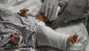 تصویر نوزادی که در پهلوی کشته شدگان، با قساوت ددمنشان به شدت زخمی شده و تحت مداوا قرار گرفته است