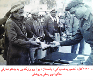 | د ۱۹۴۸ کال د کشمير په شخړه کې د پاکستان د پوځ یو بریګډیر په پښتنو قبایلي جنګیالیو وسلې وویشلې. |