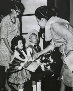 درین مسافرت و پذیرایی صمیانه و عالی مقامات امریکایی و مردم آن، از علیاحضرت ملکۀ معظمۀ افغانستان هم قدرمندی و استقبال گوناگون صورت گرفت. در عکس فوق ملکه حمیرا را حین نوازش دو کودک امریکایی به استقبال وی پرداخته اند مشاهده می نمایید. دخترک امریکایی از ملکۀ افغانستان می پرسد که برعکس دیگر ملکه هایی که وی عکس های شان را مشاهده نموده است، چرا وی تاجی بسر ندارد. علیاحضرت جواب میدهد که: