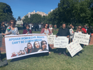 به ارتباط به موضوع حیاتی موقعیت اجتماعی و حفظ دست آورد های ۱۹ سال اخیر زنان کشور مخصوصاً در زمینۀ تحصیل و کار، مظاهره ای در شهر واشنگتن برای حمایت از حقوق حقۀ زنان کشور به اساس متون قانون اساسی و قوانین فرعی آن قشر مهم اجتماع افغانی برگزار گردید. درین مظاهره قطعنامه ای که با ترجمۀ انگلیسی برای مقامات مهم امریکایی و ارسال به مجالس «مذاکرات دوحه – قطر» از جانب افغانان مقیم امریکا تهیه گردیده بود هم قرائت گردید که متن آن چنین تحریر گردیده است: