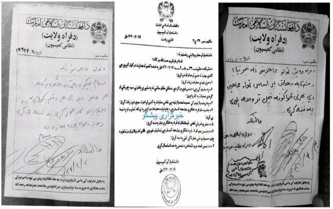 په ځينو پاڼو کې د طالبانو د فراه ولايت د نظامي کمېسيون له خوا ليکل شوي: “و ټولو مجاهدينو ته اسلام عليکم ورحمته الله و برکاته: هر مجاهد بايد چې هر رقم کولای سي و امريکايانو ته کار جوړ کړي، په نښه دې کړي زموږ د خوا پوره اجازه ده.”