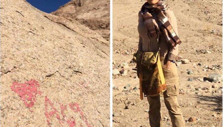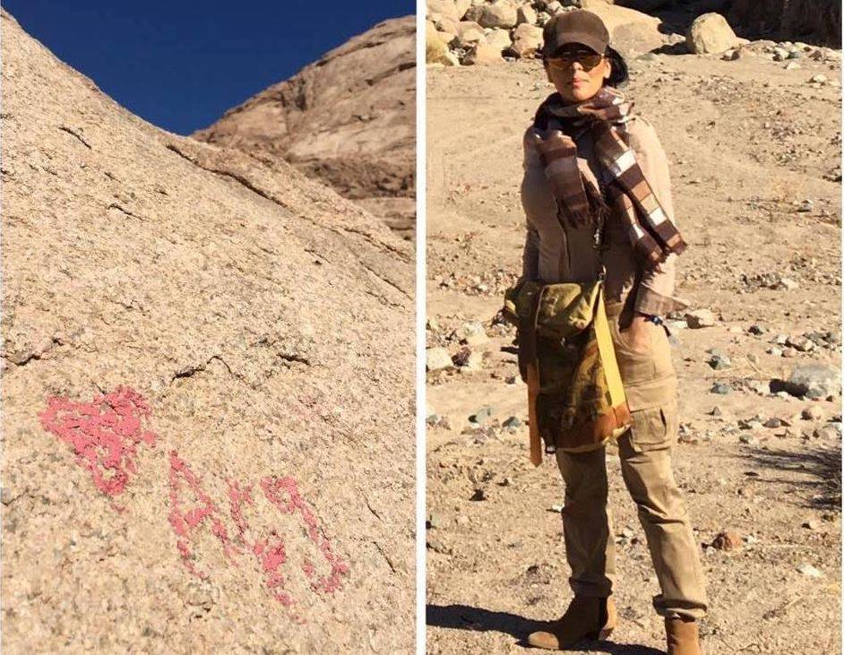 زرغونه منگل در کوه سینا در مصر. او در توضیح این تصویر، آورده بود در جایی که ایستاده، کلمه ی معزز «افغان» را نوشته اند.