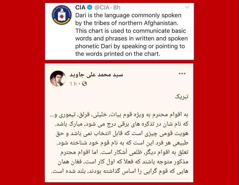 پُست سی آی ای در شبکه های اجتماعی و استقبال درج کل هویت های قومی، حتی از سوی وابسته گان ولایت فقیه در ایران. با پُست سید محمد علی جاوید، هراس سرور دانش را بهتر می توان درک کرد. در حالی که معاون دوم رییس جمهور، خاینانه به تیم ستمیان پیوسته، درز های تباری آنان بیشتر می شوند. این فاصله در جریان جنگ های داخلی، تا سرحد رهبر حزب وحدت(مرحوم عبدالعلی مزاری) قربانی گرفت. ناسیونالیستان هزاره که دیگر دوست نداشتند زمان امور آنان را چند سادات شیعه به نام روحانیت مرتجع بگیرند و از این طریق، سود های کلان سیاسی و اقتصادی کنند، با آنان درگیر شدند. پُست سید محمد علی جاوید، یک نوع دهن کجی به حامیان مرحوم مزاری نیز است. چند دسته گی در میان آنان، تنوع یافته است. تعدادی با محوریت «عباس دلجو»، از چند سال به این سو، کار فرهنگی می کنند که از قوم «هزاره» نیستند. آنان خود را «تُرک» می دانند. به نظر آنان، «هزاره»، ابدال نام شاخه ی «ازره» است و ربطی به بازمانده گان چنگیزخان در منطقه، ندارد.