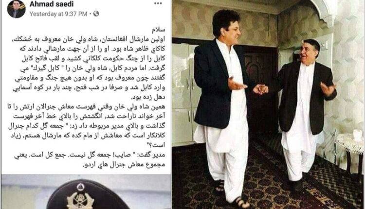 هنگام تفویض رتبه ی فرمایشی مارشالی به عبدالرشید دوستم، مردم ما اعتراض کردند که چنین حاتم بخش های سیاسی که در حکومت غنی، کاملاً غنی شده اند، ارزش ها را زیر سوال می برند. با این استدلال، یاد مرحوم مارشال شاه ولی خان نیز زنده شد که برخلاف ادعای آن خشتک کشال حامی شر و فساد، هنگام پاک سازی سقوی اول، جان فشانی ها کرده بود و تلاش های او باعث شدند تا دجال زمانه(بچه ی سقو) که تا سرحد گروگان گیری نوامیس شهید اعلی حضرت نادرخان و برادرانش، از اسلام بُریده بود و با تلاش تمام همتباران مزرورش که باسواد و بی سواد می خواستند از طریق جهالت مذهبی اکثر پشتون هایی که قدر شاه امان الله را ندانستند، درز هایی ایجاد کنند که در اقتدار سیاسی ما فقط با نیرو های خارجی، رونما می شوند.