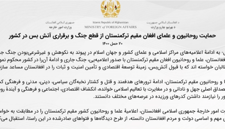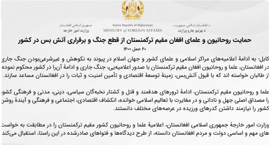 د بهرنیو چارو وزارت څخه په خپره شوې خبرپاڼه کې ویل شوي، چې په ترکمنستان کې میشت افغان عالمانو د افغانستان جګړې په اړه ویلي، چې طالبانو یواځې د مسلمانانو وینې بهیدل روان کړي او د روانې جګړې ډول یې د اسلام له ټولو قوانینو سره خلاف عمل دی.