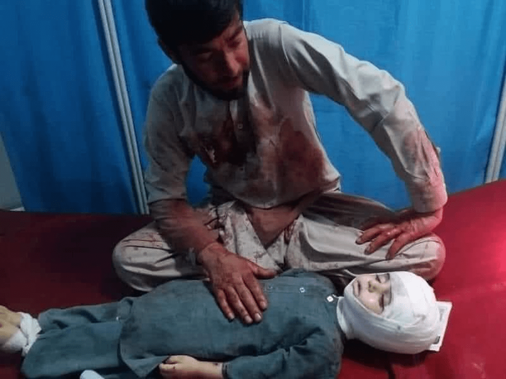 «په وینو ککړ ځوان حیران ناست دی او خپلې مخې ته پر غځیدلي ماشوم یې سترګې ګنډلي دي.