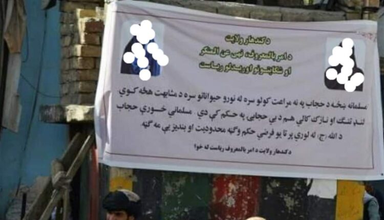د ط.. البانو ا.مـ.ر بالمعـ.روف د کندهار ښار پر سرکونو لوحې لګولي او پرې لیکل شوي، کومې ښځې چې اسلامــ.ي حـ.جاب نه کوي “له حیواناتو سره د مشابهت هڅه کوي”.