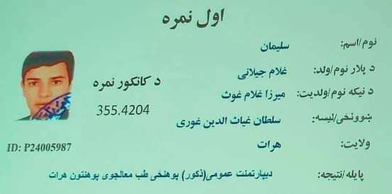 سلیمان د ۳۵۵.۴۲ نمرو په اخیستلو د کانکور عمومي اول نمره اعلان شو.
