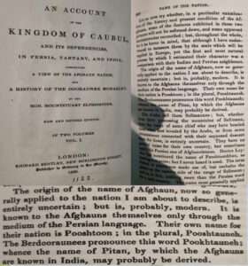 مونتستیوارت الفونستون در کتاب معروف خود “گزارش سلطنت کابل….” که در سال 1810 میلادی بعد از اقامت یکساله خود در افغانستان نوشته شده و در سال 1839 میلادی در لندن چاپ و نشر شده است یعنی هفتاد سال قبل از امیر عبدالرحمن خان می نگارد که قوم پشتون را فارسها افغان، زبان آنها را افغانی و وطن آنها را افغانستان می نامند در حالیکه خود پشتونها قوم خودرا پشتون، پختون، پختانه می نامند زبان خودرا پشتو میخوانند و وطن خودرا پختونخوا. (این مطالب در صفحات ۲۰۰ تا ۲۲۰ کتاب او نوشته شده است). چون زبان فارسی از زمان سامانیان، غزنویان غوریان، و مابعد زبان رسمی خط و کتابت اداری دولتها بود بنابر آن از اصطلاحات فارسی افغان، افغانی و افغانستان در کتب تاریخ و در ادبیات عصر استفاده شده است. به همین اساس فراموش نکنیم که با انتقال پایتخت از قندهار به کابل توسط تیمورشاه سه نسل امیران و خانواده های بارکزاییها، سدوزاییها، محمدزاییها و غیره در کابل و در فرهنگ فارسی بزرگ شده با ازدواجهای مختلط قومی زبان پشتو را استفاده نکرده پشتونهای فارسی زبان را تشکیل داده و ناگزیر از اصطلاحات مروج زبان فارسی مانند افغانها در اشاره به پشتونها و زبان افغانی در اشاره به زبان پشتو و افغانستان در اشاره به وطن پشتونها استفاده میکردتد و حتی امروز هم استفاده میکنند. بنابر آن هیچ جای تعجب نیست که امیر عبدالرحمن خان، امیر حبیبالله خان و امیر امان الله خان و محمود طرزی به زبان پشتو بنام زبان افغانی اشاره کنند. اما حقیقت آن است که برای خود قوم پشتون مردم شان پشتانه یا پختانه و زبان شان پشتو یا پختو بوده و است طوریکه یکصد و پنج سال قبل از اولین کتاب درسی به اصطلاح افغانی در معارف در زمان حبیبالله خان، رواج کلمه پشتو در میان پشتونها توسط مونتسوارت الفونستون تصدیق شده است. به عکسهای اتی از بعضی صفحات کتاب او توجه کنید: (چاپ تازه این کتاب را از روی پی دی اف کتابخانه کانگرس آمریکا میتوانید از آمازون و ای بی Ebay خریداری کنید).