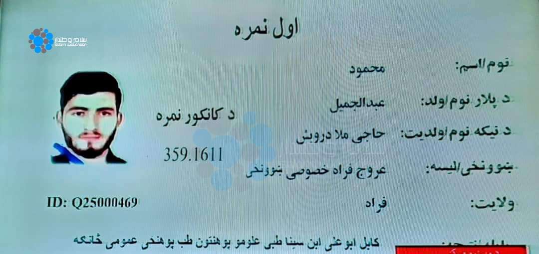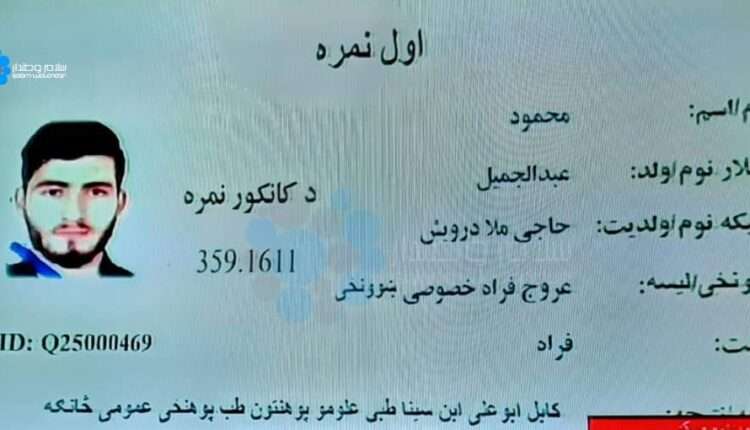 محمود د عبدالجمیل زوی د فراه اوسېدونکی د ۳۵۹،۱۶ نمرو په اخیستلو سره د سږني کانکور اول نمره شو.