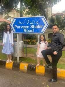 یادونه: په تصویر کې د اسلام اباد یو سرک ګورئ، چې د پروین شاکر په نوم نومول شوی دی. مخې ته یې د هغې زوی (مراد) ولاړ دی او څنګونو ته یې لمسیانې (شانزی پروین او آریه) دي.