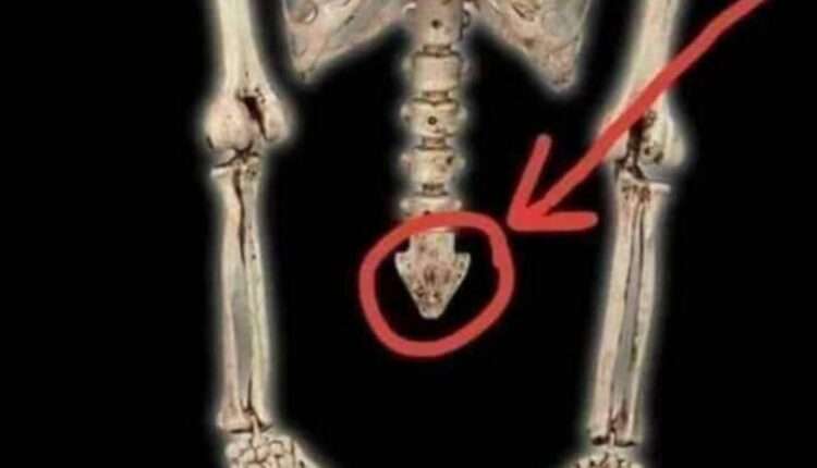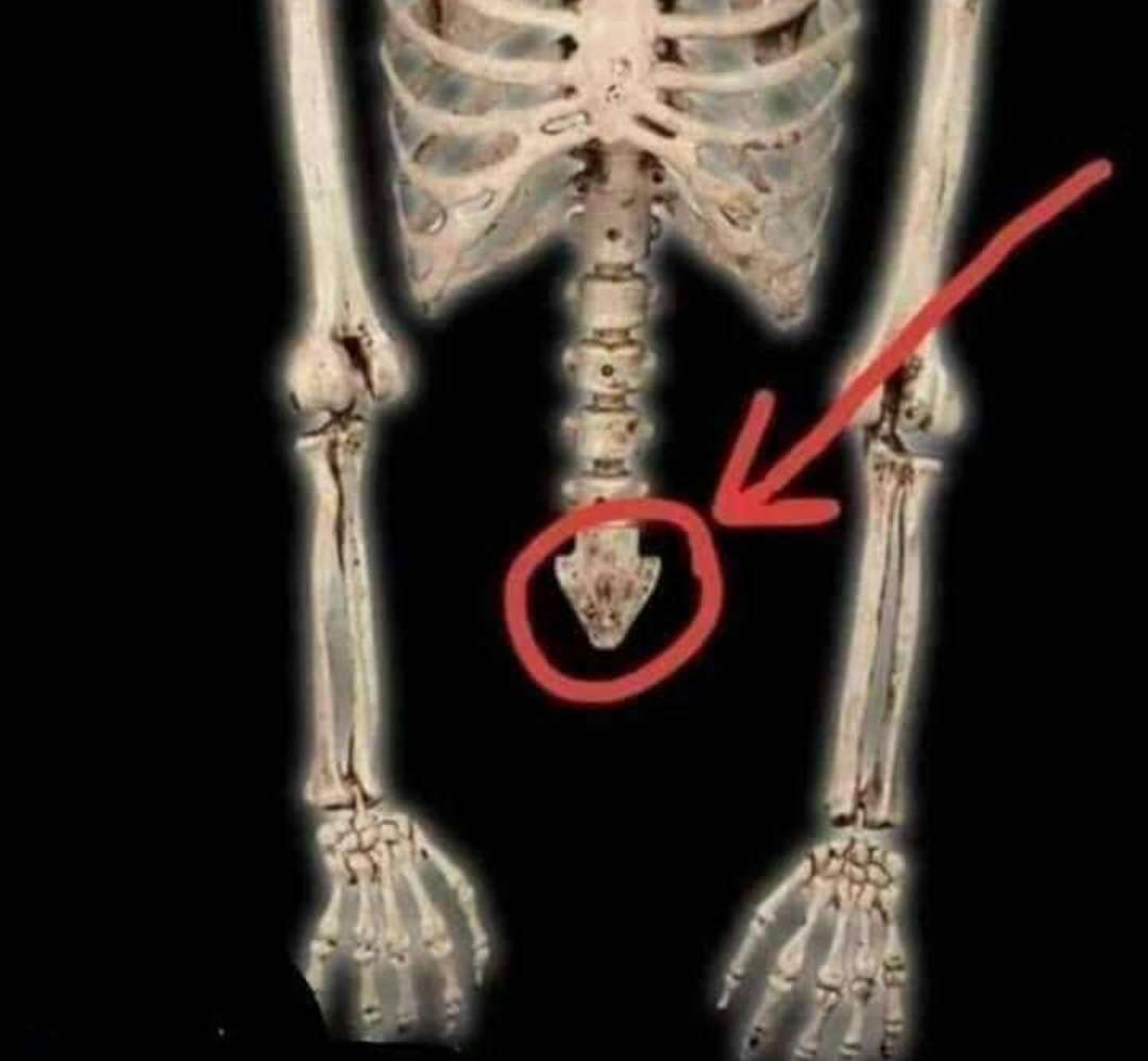 په تصویر کې د انسان د ملا په تیر کې هغه اخېرني هډوکي ته اشاره شوې، چې په حدیث کې ورته (عجبِ ذنب) او د طبي ساینس په اصطلاح کې ورته ټیل بون (Tail bone) ویل کیږي.