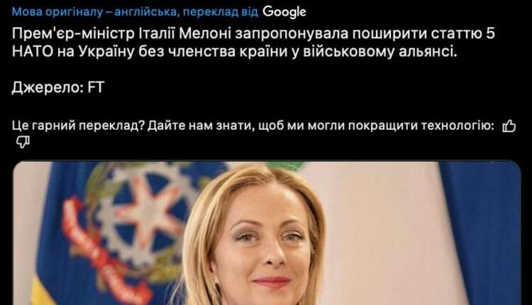 روم، FT – د ایټالیا صدراعظمې جورجیا میلوني وړاندیز کړی چې د NATO د ۵مې مادې دفاعي اصول باید پر اوکراین هم عملي شي، حتی که اوکراین د دې نظامي اتحاد غړی نه وي.
