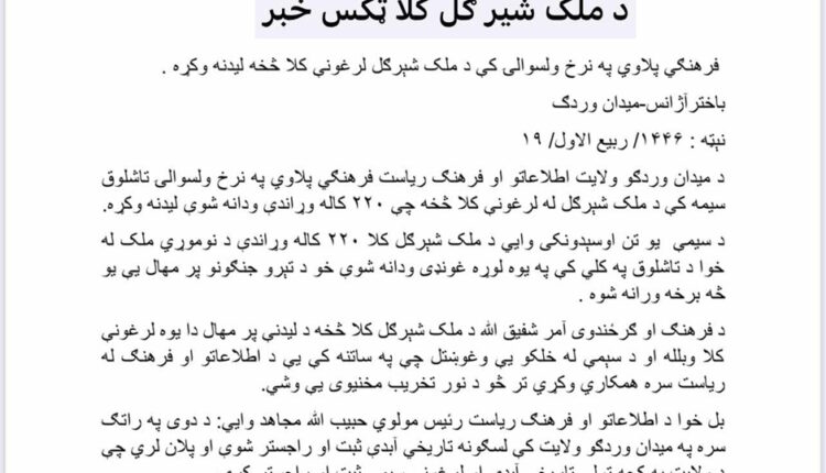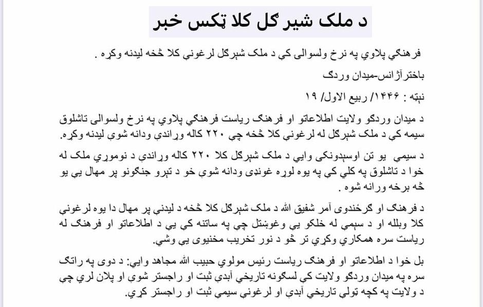د تاشلغ یا د نرخ بالاحصار ته طالبان د پاملرنې هوډ راپور: د شرف الدین ستانکزی د تاشلغ لرغونې کلا د وضعیت د خرابۍ په اړه د (دعوت مېډیا۲۴) له خبر سره سم د میدان وردګو ولایت مسولینو تاریخی ابدو په ځانګړی توګه د ناشلغ د کلا د سالم حفاظت مرمت او له مینونو د پاکیدو د ژمنې تر څنګ وویل چه یادې سیمې ته یې مسلکی پلاوی تللی او لنډه راتولنکې کې یې بیا له نږدې ګوری د میدان وردګ داطلاعاتو کلتور د ریس قاری حبیب الله مجاهد، له د خبرو سره یو مکتوب هم د ټلفون له لارې د لوستونکو دلا ښه باور په مقصد راسره شریک کړ چه تاشلغ ته یې په داوروستیو کې کاری پلاوی لیږلی دۍ تاشلق، یا تاشلغ، د میدان وردګ نرخ ولسوالۍ عمرخیلو قریه کې ودانه دۍ د ملکیت امتیاز یې د شرګل حان، ورثې ته رسیږی که څه هم دسیمۍ خلک یې په اړه له ۲۲۰ کاله راهیسې پوهیږی مګر ځینې شواهدو ته په کتو ښایی تر سلګونه کاله پخوا داکلا، ودانه او نرخ کې د یوې مستحکمې نظامی چوڼۍ یا بالاحصار په بڼه دوخت واکمنو کارولی وی.