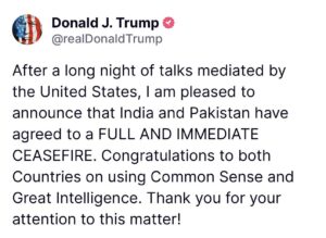 د امریکا ولسمشر ډونالډ ټرمپ وایي د پاکستان او هند دولتونو سره له خبرو او منځګړتوب وروسته دواړه خواوې په «بشپړ» او «سمدستي» اوربند رضا شوي دي.