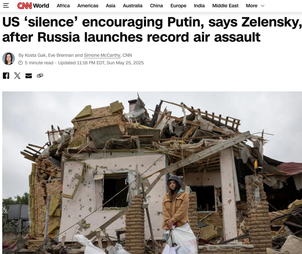 ۲۶ مې ۲۰۲۵-کېیف – CNN تازه په خپل راپور کې ويلي دي چې د اوکراین ولسمشر ولوديمير زېلېنسکي هغه بيان چې د ستر هوايي برید وروسته ؛کوم چې روسیې نږدې ۳۷۰ راکټونه او ډرونونه پر اوکراین وتوغول، لوېدیځ ته په خطاب کې ويلي چې د نړیوالو چوپتیا پر اوکراين د روسیې یرغل دوامداره کيدو ته لاره هواروي.