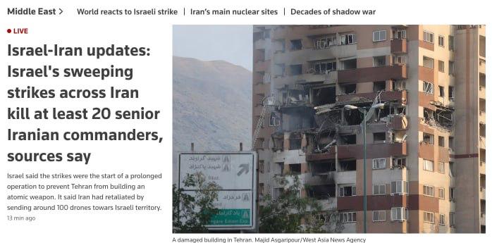 ۲۰۲۵ د جون ۱۳مه -په منځني ختیځ کې تاوتریخوالی نوي لوړې کچې ته رسېدلی، کله چې اسراییلو تېره شپه د ایران پر اتومي او پوځي تاسیساتو پراخ هوايي بریدونه وکړل.