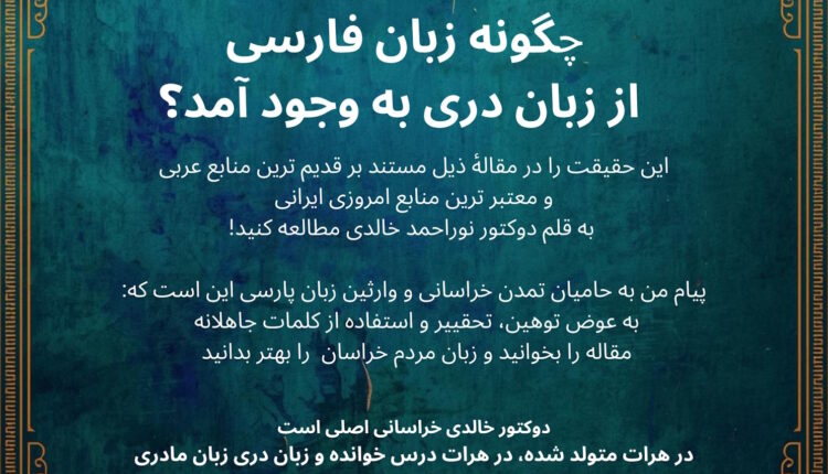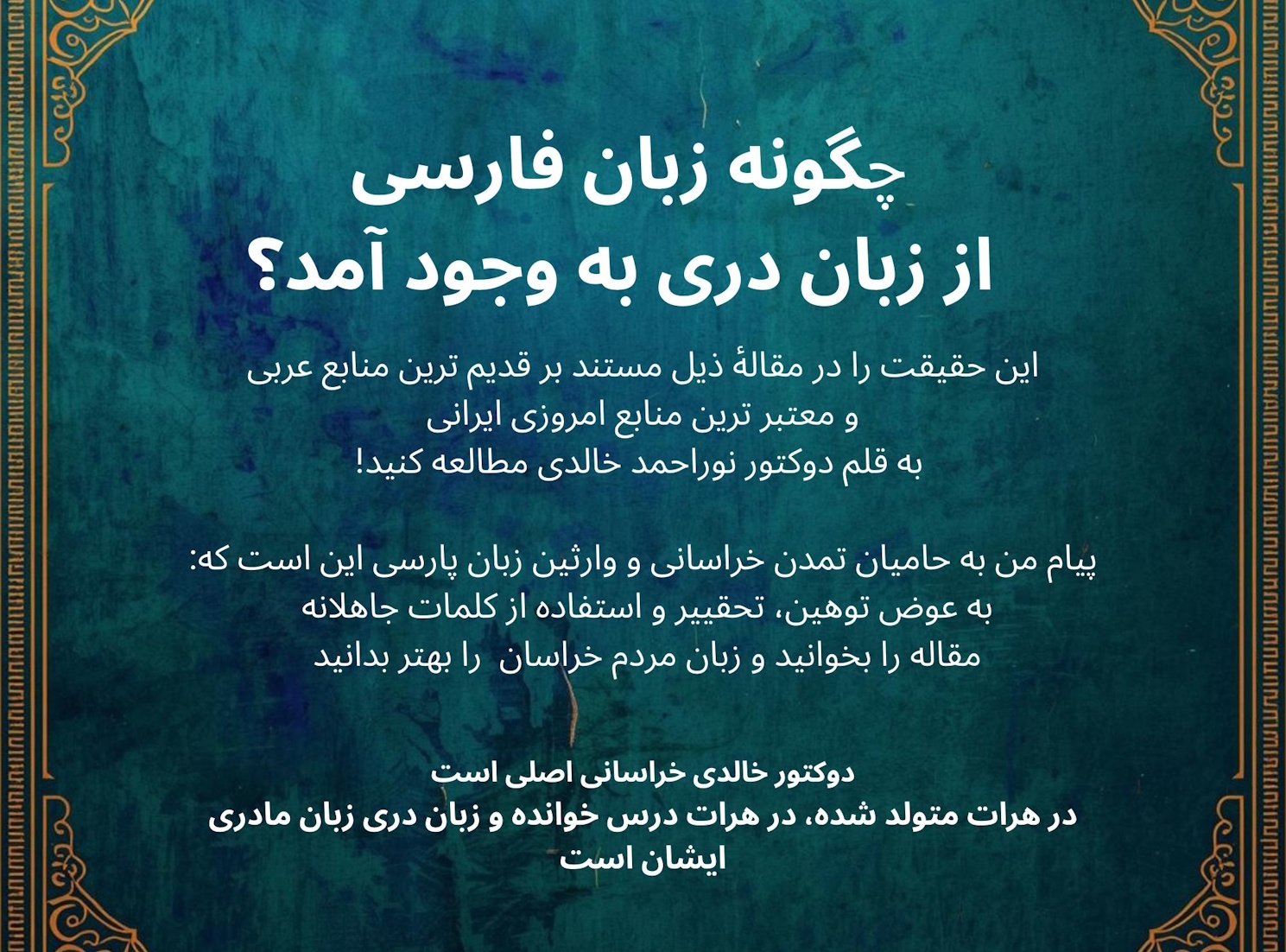 آنچه امروز به نام زبان فارسی در جهان شناخته میشود، در واقع زبان دری مردم خراسان (نیشاپور، بلخ، مرو، هرات) است که در پی تحولات سیاسی و مهاجرت نخبگان و انتقال پایتختها در دوران سلجوقی، بر جغرافیای ایالت فارس و مناطق مرکزی تحمیل و جایگزین زبانهای بومی (فهلوی) گردید. در این مقاله، این حقیقت تاریخی برجسته شده است که آنچه امروز «فارسی» نامیده میشود، در واقع زبان دری مردم خراسان (مرو و بلخ) است که بعداً به مناطق غربی (فارس) صادر شده است. لذا این زبان (زبان فارسی امروزی ایران) همان زبان دری مردم خراسان است که از شرق از خراسان به ایران امروزی انتقال و گسترش یافته است نه برعکس آن وانتساب ریشهای این زبان به ایالت فارس، یک خطای تاریخی است که بر اثر جابجایی نامها صورت گرفته است.