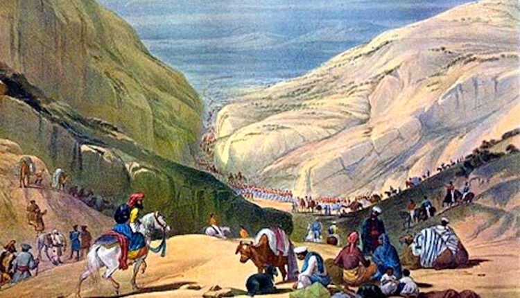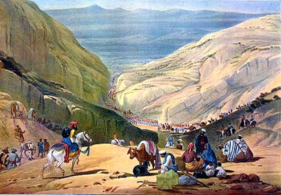 همدا شان موږ کله چې مزل کاوه افغانانو به د غوڼډۍ نه، د کاروان کمزوری څڼډې په نښه کولې او راښکته به شول، ساتونکې به یې ووژل او په اکمالاتو بار څاورې به یې د ځان سره وځغلول… چې د دیارلسو پر له پسې بریدونو او چاپو په ترڅ کې یې زموږ د غاړې نه لږ تر لږه دری زرو کسان ووژل … چې ایلفنسټون یې ستړی او دوه سونګو ته راوست … او هغه بیا د پوټینګر په خواهش او مشوره اکبرخان سره د جوړ جاړی په هیله کاروان توقف کړ، مګر شیلټن په غوسه ؤ او هغه ټینګار کاوه چې شپې تیارې د خپریدو نه مخکې موږ باید د خورد-کابل له تنګي نه واوړو…