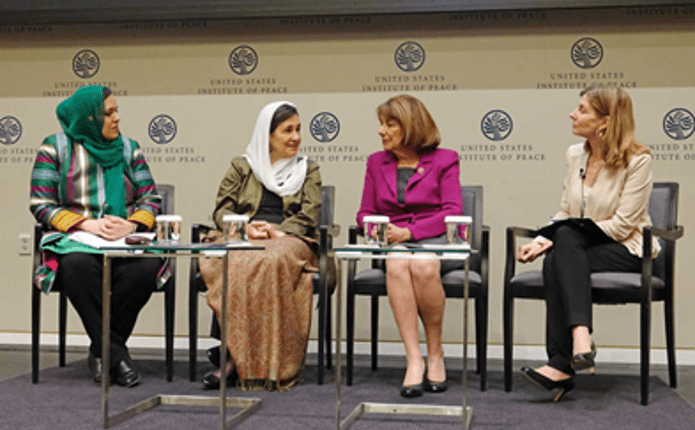 سلام و علیکم، من برای منظور امکانات برقراری صلح در افغانستان به اینجا آمده ام؛ ممنون از مرکز و ادارۀ صلح واشنگتن که این امکان را میسر ساخت که با شما ملاقات داشته باشم. رول و سهم زنان در بر آورده ساختن امکانات صلح در مملکت جنگ زدۀ ما، عنوان مذاکرۀ امروز را تشکیل میدهد که تعداد زیادی از زنان سرزمین ما حاضر به فعالیت درین زمینه هستند.