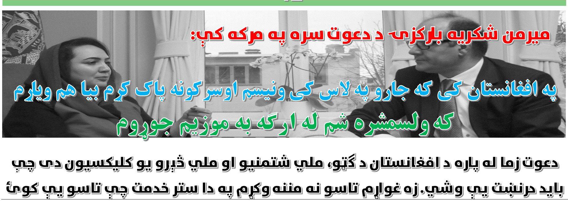 میرمن شکریه بارکزۍ: زه پوهیږم چې په کومو شرایطو باندې افغانان له افغانستان وتلي دي او په دې باندې هم ښه پوهیږم چې دوۍ څومره د خپل هېواد له پاره درد، زښته زیاته مینه او علاقه د افغانستان سره لري. زه ځانته دا جرئت ورکوم چې د دوۍ د یوې خور په صفت باندې درې ابتدایي پوښتنې ولرم او صرف نطر له دې نه چې د کوم ولایت، کومې ژبې او کوم مذهب پورې اړه لرې صرف د افغانیت په خاطر باندې د یو بل سره ودریږۍ. صرف په دې نامه باندې چې وطندار، وطنداري.