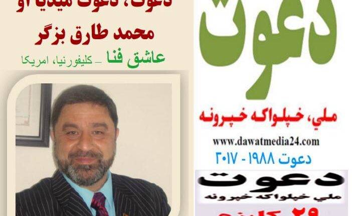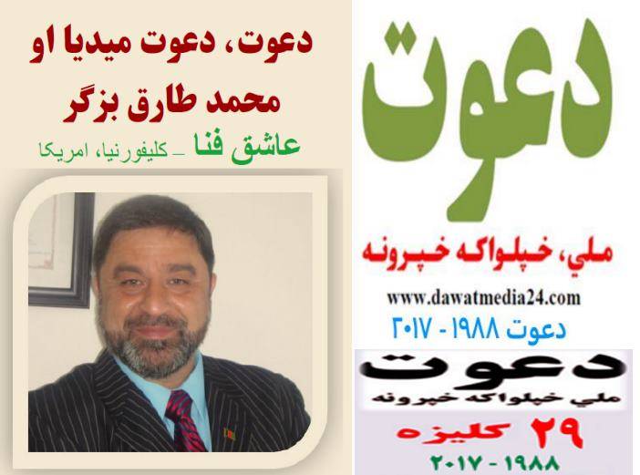 دعوت، دعوت میدیا او محمد طارق بزګر د اوسني نړيوال سياسي – کلتوري تاريخ زرينې پاڼې دي. په دې زرينو پاڼو به کتابونه وليکل شي او د بشري افتخاراتو په خزانه کی به خپل ځلانده او روښانه ځاي ولري. طارق بزګر. دعوت او دعوت ميډيا د افغانستان او افغانانو په ټولنيز ژوند کی د نوښت. بدلون او مثبت پرمختګ علمي او منطقي زيری دی. بزګر، دعوت او دعوت ميډيا هغه انساني رو ښانه څراغونه دي چې د ټولنې تاريکو برخو ته د علم، سعادت، پرمختګ، آزادۍ او خپلواکۍ رڼا خوروي. د دعوت هره شيبه، هر ساعت، هره ورځ او هر کال دې ټول بشريت ته مبارک شي. احترام به صلح و بشريت عاشق لونګين فنا مبتکر و صاحب امتياز نړيوال زرغون نښان مدال جهاني انسانيت – صلح – علم.