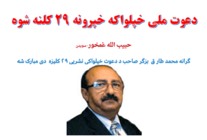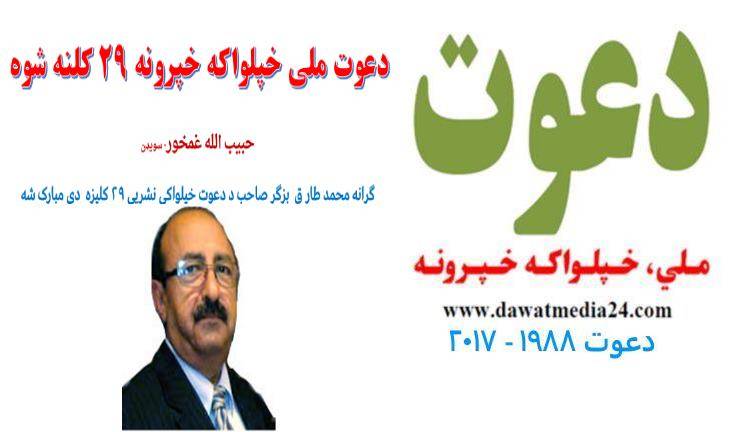 په ډير وياړ تاسو درانه او په فرهنگی هڅو کې نه ستړي کېدونکي شخصيت، د دعوت ملي خپلواکې خپرونې مؤسس، ستاسو کاري ملگرو او قلمي همکارانو ته چې د دي نشراتي ارگان پاڼې په سمبالتيا کې ستاسو سره مرسته کړې د دعوت ملی خپلواکې خپرونې د۲۹ کليزي په مناسبت د گلو د گېډی په ملتيا د دې نشريې د لوستونکي او قلمي همکار په توگه زماد زړه له کومې مبارکی او نېکي هيلي قبولي کړئ .
