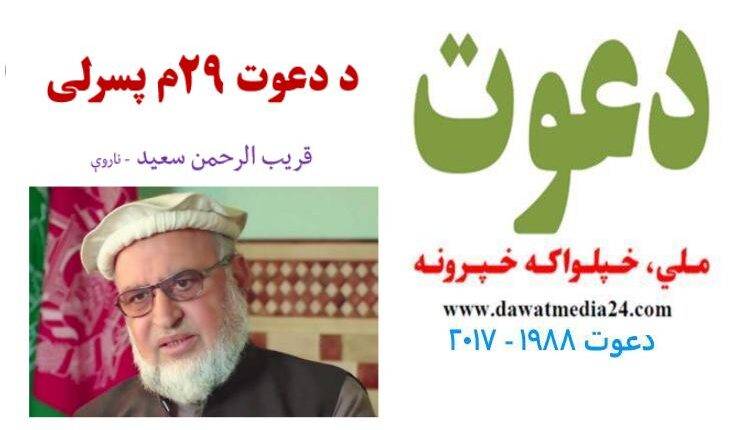 زه د دعوت بنسټ ایښوونکي مسؤل مدیر، محترم محمد طارق بزګر ته د دغي ملي خپروني د ۲۹مي کلیزي په مناسبت د زړه له کومی مبارکی وایم او د الله تعالي نه ورته په دي اړه د لا زیات توفیق غوښتونکي یم .