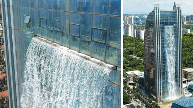 دا مصنوعي ابشار په ګیوايي یانګ ایالت کې د یوې بین المللي پلازې په اخېر پوړ کې جوړ شوی او لاندې ترې اوبه را تویېږي.