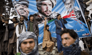در پوستر نمونه در حالیکه در گوشۀ راست تصویر عبدالله عبدالله به نظر میخورد، در وسط – عکس احمد شاه مسعود